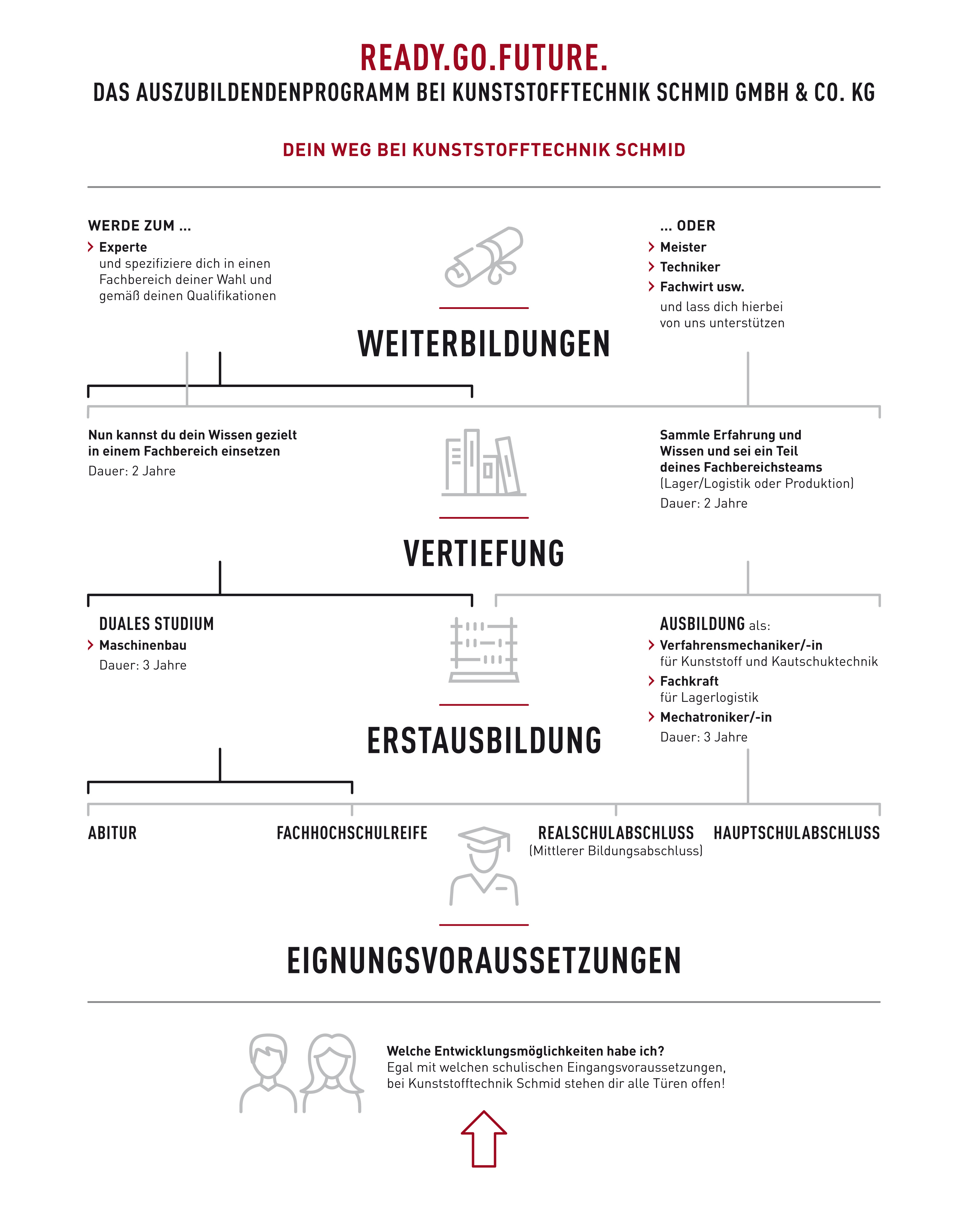 Du stehst kurz vor deinem Schulabschluss und hast Interesse an einer Ausbildung oder an einem Studium? Ob als Azubi oder dualer Student: Bei uns kannst du schnell Verantwortung übernehmen! Schau dir an, welche Ausbildungen und dualen Bachelorstudiengänge wir anbieten und entscheide dich für deinen Weg bei Kunststofftechnik Schmid.