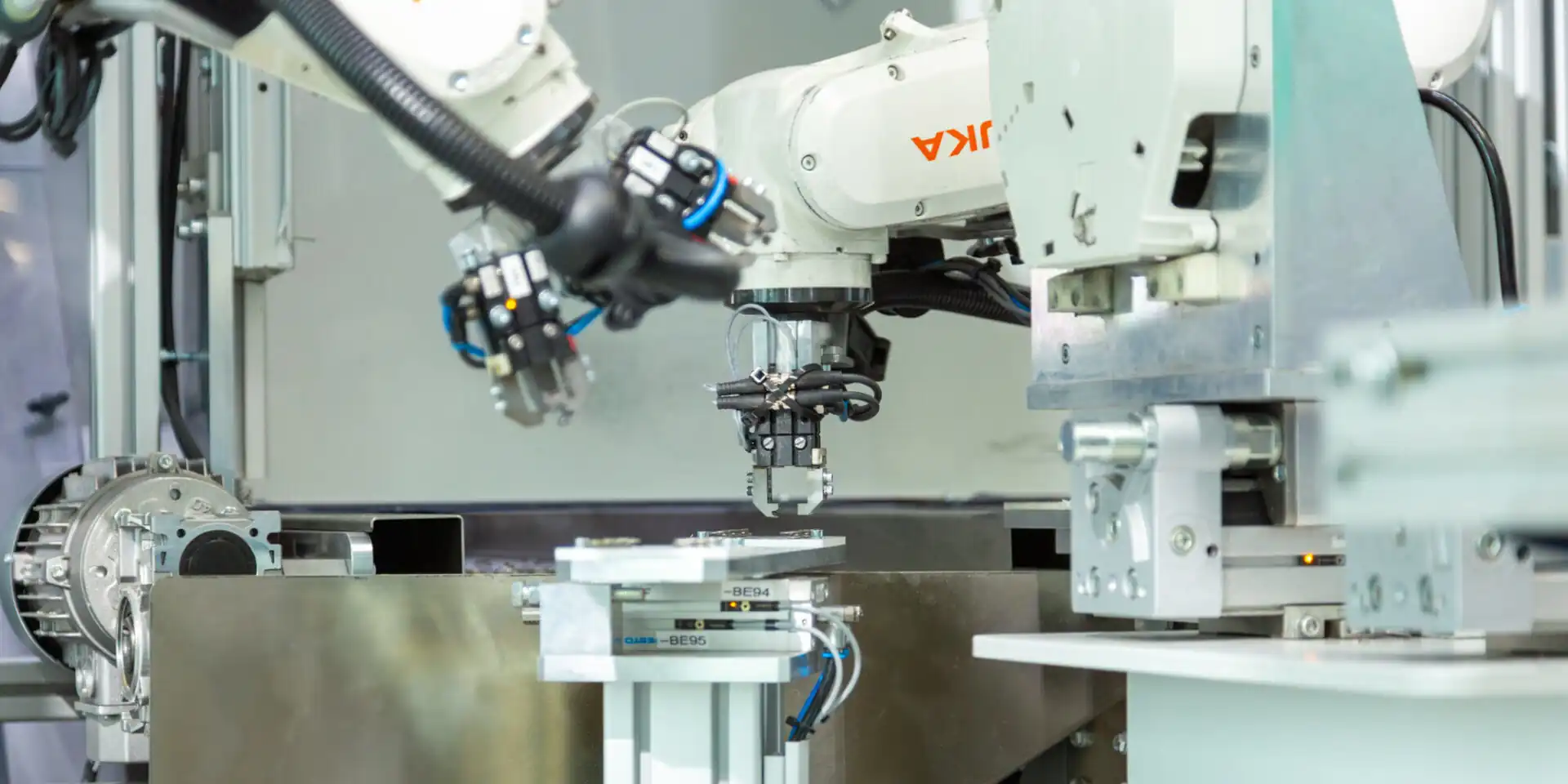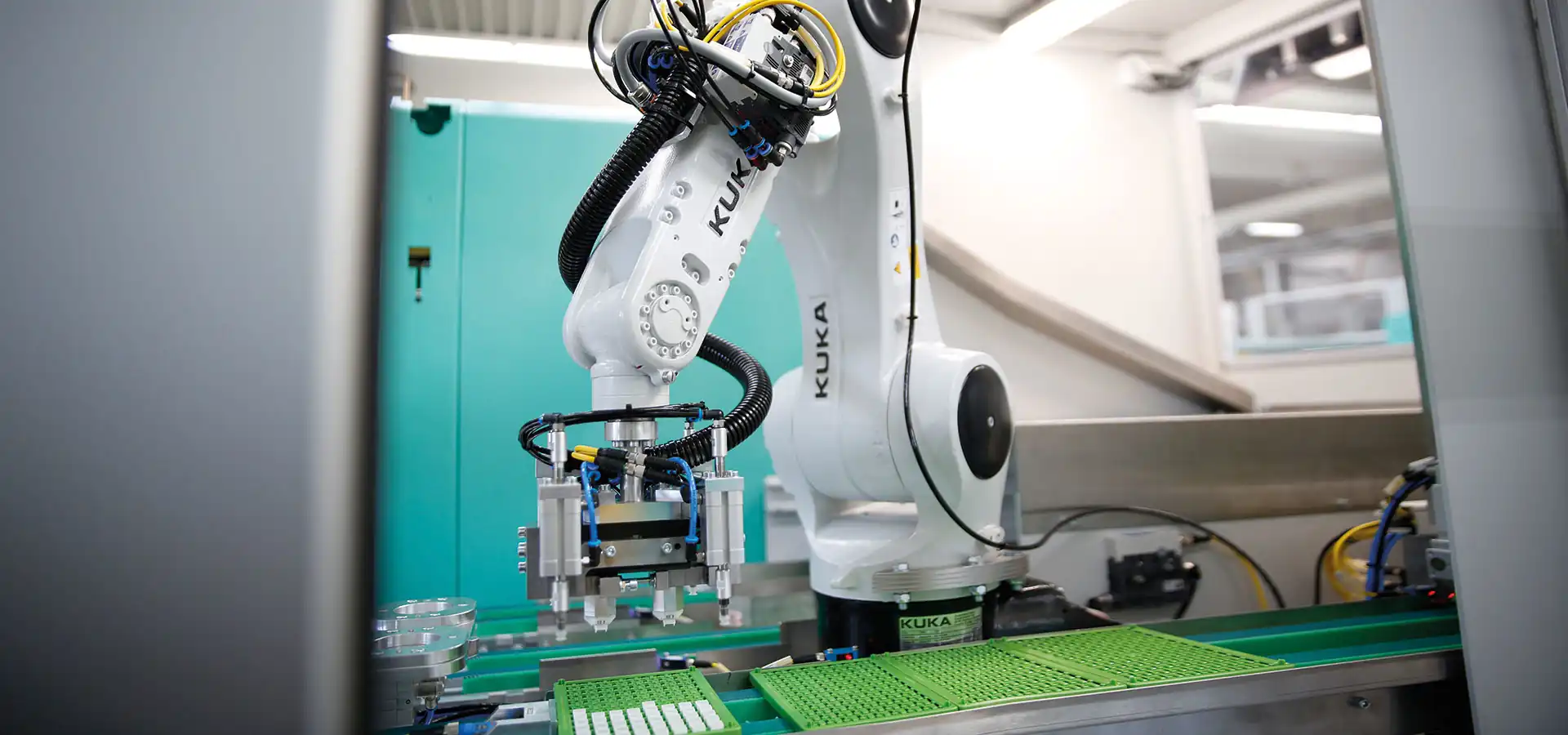 Aufgrund der stetig wachsenden Anforderungen an Spritzgussteile und Baugruppen setzen wir auf Automatisierungslösungen aus unserem hauseigenen Sondermaschinenbau. Gerade bei komplexen Bewegungsabläufen (wie z. B. Pick and Place, Baugruppenmontage oder die Nachbearbeitung) kommen Sechs-Achs-Roboter zum Einsatz. Eine kamerabasierte Qualitätsprüfung sowie eine vollautomatische Verpackung in versandfertige Trays bieten wir Ihnen als Komplettpaket aus einer Hand.